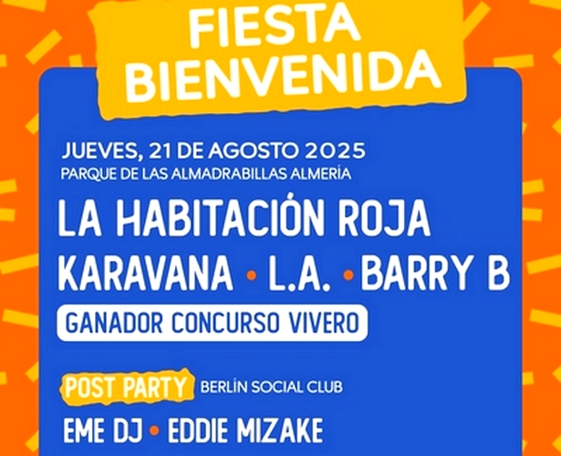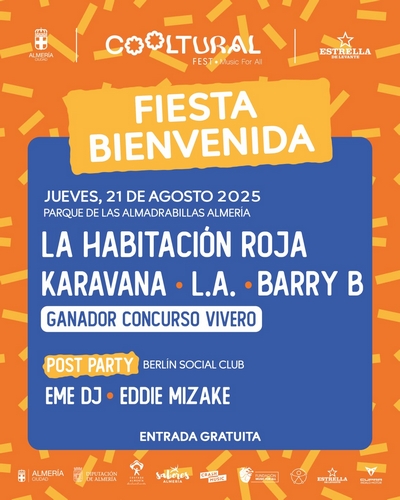 El festival almeriense Cooltural Fest ha desvelado hoy el cartel de lo que será la fiesta de bienvenida de su octava edición. Una iniciativa más que consolidada y que se celebrará en la jornada previa al desarrollo del grueso de la programación en el Recinto de Conciertos del Ferial (días 22, 23 y 24 de agosto), es decir, el jueves, 21 de agosto, repitiendo enclave en el Parque de las Almadrabillas. Las bandas que conforman el cartel para la velada, como siempre en este caso de entrada libre, serán La Habitación Roja, L.A., Karavana, Barry B, el ganador de la segunda edición del Proyecto Vivero, que se pondrá en marcha en próximas fechas y para la ‘post party’ con los Eme Dj y a Eddie Mizake.