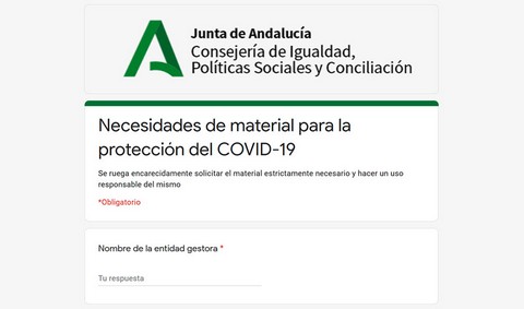 La Consejería de Igualdad, Políticas Sociales y Conciliación ha puesto a disposición de las entidades gestoras de los centros residenciales para personas mayores y con discapacidad de Andalucía un formulario ‘online’ donde se recojan las necesidades de material a raíz de los protocolos de seguridad sanitaria establecidos como consecuencia de la llegada del Covid-19 a la comunidad. En una siguiente fase de este proyecto, este formulario se remitirá igualmente a las comunidades terapéuticas de titularidad de la Junta de Andalucía.