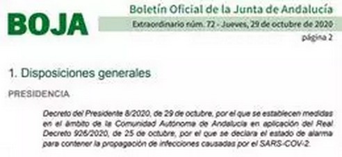 El Boletín Oficial de la Junta de Andalucía (BOJA) ha publicado poco antes de las 23 horas de este jueves una edición extraordinaria con un decreto del presidente, Juanma Moreno, sobre medidas en aplicación del estado de alarma para contener la propagación de infecciones causadas por el SARS-COV-2 que regula el cierre perimetral de la comunidad y el confinamiento de más de 4,5 millones de habitantes de 449 municipios de las provincias de Cádiz, Córdoba, Granada, Jaén, Málaga y Sevilla desde las 00.00 horas de este viernes y hasta el próximo 9 de noviembre.