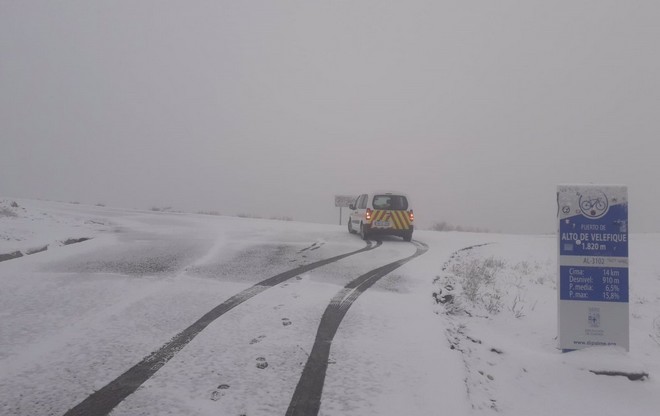 La nieve ha obligado este domingo a cortar las carreteras de la AL-5406 Las Menas, la AL-3202 Alto de Velefique-Bacares y, por último, la AL-4404 Calar Alto, que se ha unido por precaución a las dos mencionadas anteriormente, ya que estas ya se encontraban cortadas desde la tarde-noche de este pasado sábado.