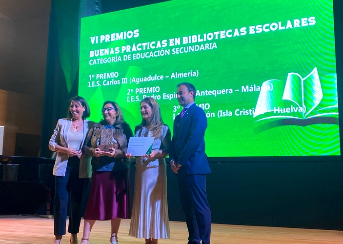 De este modo, el I.E.S. Carlos III de Aguadulce ha recibido el primer premio, consistente en dotación económica de 5.000 euros y trofeo, por expandir su biblioteca en el espacio virtual y crear Bibliomakers (concepto que aglutina, materias, departamentos, espacios, planes y programas, centros de la localidad, formación del profesorado) como un un recurso acelerador de la innovación en el centro.