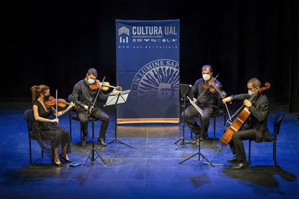 Tal y como ya se adelantase en la presentación de la programación completa de Cultura UAL, en este curso 20-21, “si la situación sanitaria lo permite, la OUAL ofrecerá siete conciertos y la coral tres más”. Todos serán gratuitos y contarán con la presencia de músicos invitados. Pero, además, se van a ofertar un total de diez cursos de iniciación y de perfeccionamiento musical: “También nos preocupa la formación de nuestros músicos”. Ese matiz que ha introducido la vicerrectora se ha visto acompañado igualmente por su mensaje de felicitación y agradecimiento a la plantilla de músicos vinculada con los proyectos de la Universidad de Almería pasados y futuros: “Aunque en este concierto de apertura se ha disfrutado solo de un cuarteto, contamos con una plantilla de casi cien músicos, a los que debo agradecer su trabajo, y felicitarles”. No se ha olvidado de una pieza clave como es la del director de las dos formaciones, orquesta y coral, Juan José Navarro, profesor del Real Conservatorio Profesional de Música de Almería y director invitado en numerosas orquestas españolas y extranjeras; “Quiero agradecerle públicamente su gran labor para que esta orquesta sea posible; son innumerables sus horas de dedicación e ilusión para trabajar por la música en nuestra universidad”.