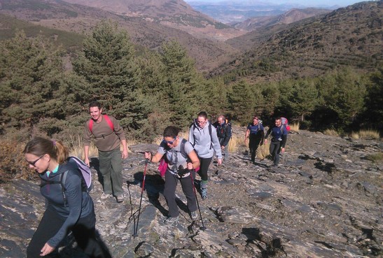 El grupo comenzó la jornada en Bacares donde se hizo un control de los participantes y se comenzó el camino, remontando el arroyo del Barrancón y escuchando continuamente el discurrir del agua que en meses fríos es considerable. Se pasó por varios cortijos o aldeas abandonadas y se vislumbraron otras en las laderas opuestas. Se alternaron senda con caminos y poco antes de alcanzar la cabecera del arroyo se tomó monte a través hacia el norte en un ascenso entre pinos de repoblación sobre terreno aterrazado. Ese ascenso acabó en una pista ya despejada de árboles, que enlazó a un cortafuegos que lleva a la cumbre de las Hoyas. Hasta Calar Alto todo es pista y asfalto hacia el final del recorrido en los Observatorios Astronómicos con una pendiente suave, pero constante hasta el final. A pie de los telescopios, esperó el autobús para hacer el traslado de los participantes hasta Bacares.