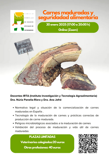 Desde el Consejo Andaluz de Colegios Oficiales de Veterinarios, en colaboración con IRTA (Instituto de Investigación y Tecnología Agroalimentaria), se convoca una formación sobre “Carnes maduradas y Seguridad Alimentaria” que se celebrará en modalidad Online (Zoom) el día 30 de enero de 2025, en horario de 17:00 a 20:00 horas y que correrá a cargo de las ponentes Nùria Panella-Riera y Ana Jofré.