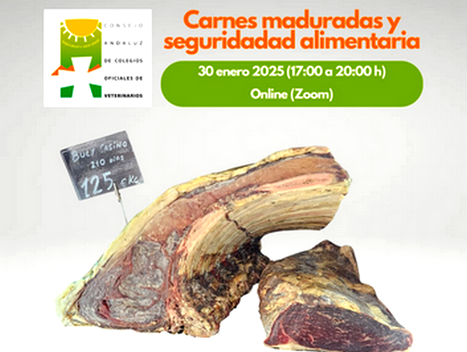 Desde el Consejo Andaluz de Colegios Oficiales de Veterinarios, en colaboración con IRTA (Instituto de Investigación y Tecnología Agroalimentaria), se convoca una formación sobre “Carnes maduradas y Seguridad Alimentaria” que se celebrará en modalidad Online (Zoom) el día 30 de enero de 2025, en horario de 17:00 a 20:00 horas y que correrá a cargo de las ponentes Nùria Panella-Riera y Ana Jofré.