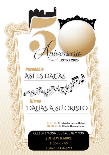 Los vecinos de Dalías celebrarán el próximo 4 de septiembre, a las 21:30 horas, en la Terraza del Casino, el 50 aniversario del pasodoble “Así es Dalías” y del himno “Dalías a su Cristo”, dos composiciones que forman parte inseparable de la identidad y el sentimiento del municipio desde que fueran estrenadas en 1975. El acto, bajo el lema “Celebremos nuestros himnos”, reunirá música, canto y baile para rendir homenaje a estas piezas y a sus autores, Hilario Huesca Luna en la música y Salvador García Rubio en la letra, así como a todas las personas y entidades que durante estas cinco décadas han mantenido vivo su legado.