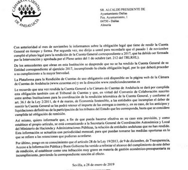 DALÍAS.- La Cámara de Cuentas de Andalucía ha requerido el Ayuntamiento la presentación de las cuentas de 2017 que debieron comunicarse antes del 1 de noviembre y amenaza con sanciones y retener las aportaciones del Estado.