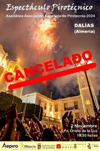 El espectáculo pirotécnico que se había programado en el marco de la Asamblea de la Asociación Española de Pirotecnia también ha sido cancelado. Agradecemos el apoyo de la Asociación y su comprensión ante esta decisión.