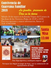 La parroquia de Pulpí lanza, un año más, la CONVIVENCIA DE CUARESMA FAMILIAR 2018, un día de convivencia en el que padres e hijos pueden vivir un momento intenso de preparación a la Semana Santa en familia. Con el lema “la familia, presencia de Dios en la tierra”, el próximo sábado, 24 de marzo, todos los pulpileños están invitados a una serie de actividades, en la Ermita del Carmen de San Juan de los Terreros, en las que se incluyen charlas sobre temas familiares, Via crucis, Santa Misa…