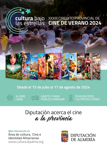 El programa de Cine de Verano de la Diputación de Almería cumple XXXIII ediciones llevando la más pura esencia de este arte a los espacios públicos de los municipios más pequeños de la provincia. Gracias a este programa las plazas de los pueblos almerienses se llenan de vecinos de todas las edades para disfrutar de una proyección al aire libre en época estival.