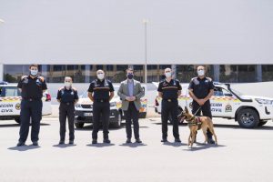 Fernando Giménez Diputado Delegado de Presidencia, Lucha contra la Despoblación y Turismo estrena tres nuevos vehículos de Protección Civil. Perro