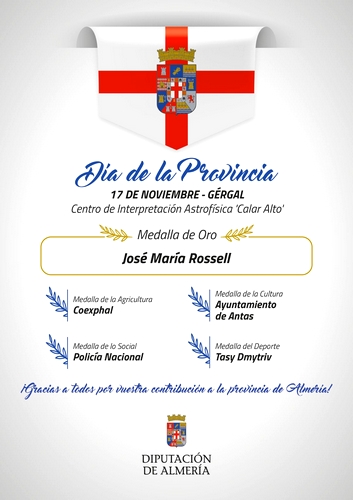 El próximo 17 de noviembre la Diputación Provincial de Almería entregará su máxima distinción, las Medallas de la Provincia 2024, en un emotivo y solemne acto que se celebrará en el Centro de Interpretación Astrofísica ‘Calar Alto’ en Gérgal. Las medallas del Día de la Provincia se otorgan a aquellas personas, instituciones y entidades que impulsan con su trabajo, talento y entrega el desarrollo y prosperidad de todos los municipios de Almería.