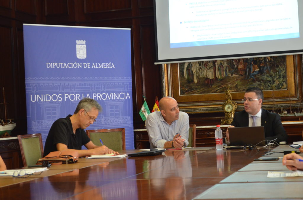 La Diputación Provincial de Almería está impulsando un modelo de gestión eficiente y segura del documento electrónico. El área de Nuevas Tecnologías, Seguridad y Vivienda ha mantenido un encuentro para seguir dando nuevos pasos dentro de la hoja de ruta que permitirá cumplir con los preceptos legales que tienen el objetivo de la eliminación total del uso del papel en la administración provincial y local.