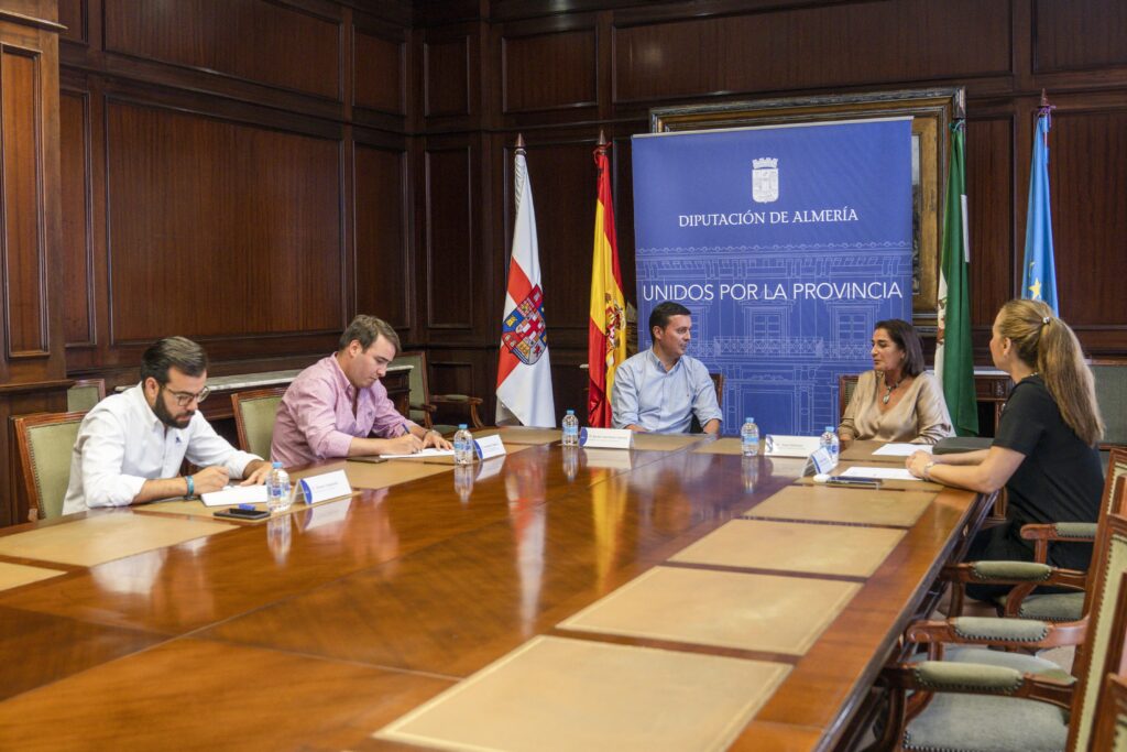 El presidente de la Diputación de Almería, Javier A. García, acompañado por el diputado de Presidencia, Fernando Giménez, y el de Hacienda, Álvaro Izquierdo, han mantenido un encuentro de trabajo con la decana del Colegio de Economistas de Almería, Ana Moreno, y la vocal de la Junta de Gobierno del Colegio, Rebeca Gómez, con el objetivo de establecer nuevas vías de colaboración que redunden en el beneficio de los almerienses.
