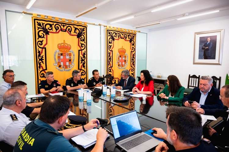 La alcaldesa, María del Mar Vázquez preside la Junta Local de Seguridad, reunida hoy para coordinar el dispositivo especial que contará con un puesto de mando y emergencias avanzado, ubicado en El Palmeral