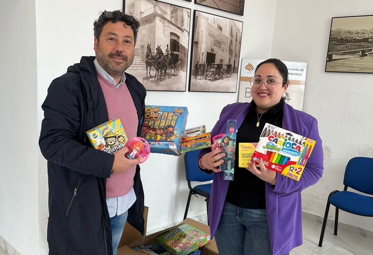 El Ayuntamiento de Cuevas del Almanzora también ha colaborado con la iniciativa aportando juegos y material escolar, del que ha hecho entrega hoy mismo a Xevi Pujol, de mano de la concejala de Políticas Sociales e Igualdad, Melchora Caparrós.