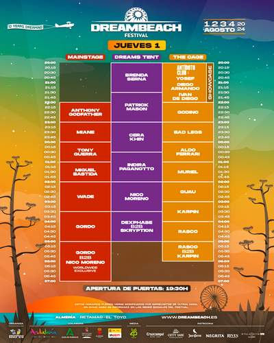 El primer gran día de Dreambeach 2024 será el jueves 1 de agosto. Una jornada de bienvenida que inaugura el recinto de Dreambeach. Nombres como Anthony Godfather, Brenda Serna arrancarán el MainStage y Dreams Tent respectivamente. Miguel Bastida, Wade o el set solo de Gordo, y el B2B de este último junto a Nico Moreno, una actuación exclusiva, brillarán en el MainStage, mientas Cera Khin, Indira Paganotto o el B2B de Dexphase y Skryption serán el reclamo en Dreams Tent. The Cage presenta esta primera noche el showcase de Antídoto Club con nombres como Guau, Karpin o Rasco.