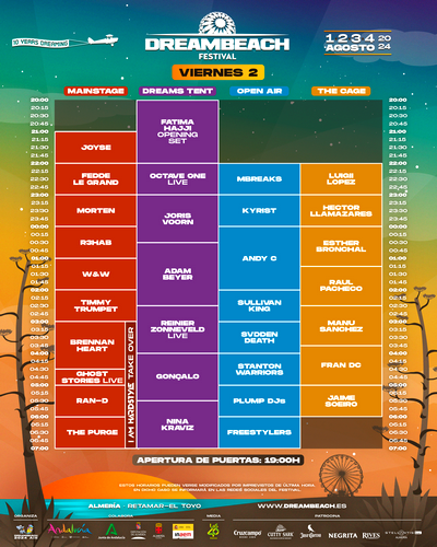 En la segunda jornada de Dreambeach el viernes 2 de agosto, el festival arrancará con el tradicional Opening Set, en esta edición a cargo de Fatima Hajji. Nombres como Timmy Trumpet, R3hab, W& W, Brennan Heart o Ghost Stories serán las estrellas del MainStage mientras Joris Voorn, Reinier Zonneveld o Adam Beyer serán los nombres más destacados en Dreams Tent.