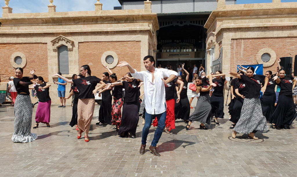 Rostros primero de sorpresa y después de felicidad, y teléfonos móviles por doquier captando en vídeo un momento tan especial, han ‘envuelto’ tanto al maestro como a sus pupilas mientras mostraban todo lo que han aprovechado el tiempo estos pasados tres días. El flashmob espectacular vivido en las puertas del Mercado Central ha servido para desarrollar la coreografía creada en una sala de baile de la aledaña Escuela Municipal de Música de Almería, y ha saltado directamente a las redes sociales. Así se ha clausurado el taller ‘Técnica y estilo de la coreografía por taranto y alegrías’, que ha roto esquemas dentro de los Cursos de Verano de la UAL por temática y por hacer público en plena calle su resultado: “Estamos muy contentos ya casi cerrando la tercera semana y la vigésima edición de estos cursos, con un taller que es toda una innovación dentro de nuestro programa, dedicado a algo muy novedoso como la coreografía flamenca”. Pilar Jerez, directora de los Cursos de Verano, ha presidido esta clausura ‘práctica’.