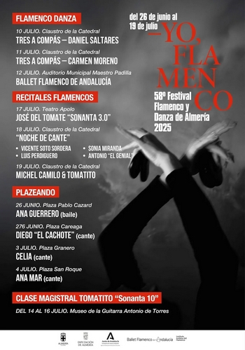 Los recitales finales llegarán en el último fin de semana. El 17 de julio en el Teatro Apolo con José del Tomate y su concierto especial ‘Sonanta 3.0’. El 18 de julio habrá Noche de Cante en el Claustro de la Catedral con Vicente Soto Sordera, cabeza de una de las sagas más genuinas del flamenco; Luis Perdiguero, que es bisnieto de otra leyenda como Tía Anita La Periñaca; y no puede faltar el carácter almeriense con los cantaores Sonia Miranda y con Antonio García ‘El Genial’.