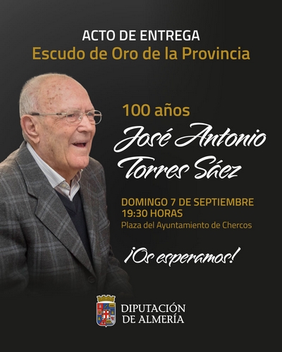 Este domingo Chercos acoge el solemne y emotivo acto donde el alcalde del municipio, José Antonio Torres Sáez, que el pasado mes de julio cumplió un siglo de vida, recibirá el Escudo de Oro de la Provincia de Diputación como reconocimiento a una vida dedicada plenamente al servicio público, primero como Guardia Civil y, desde 1995, como alcalde de su pueblo. El acto, que estará cargado de sorpresas y al que se ha invitado a las autoridades de la provincia, tendrá lugar en la Plaza del Ayuntamiento a partir de las 19:30 horas del domingo 7 de septiembre.