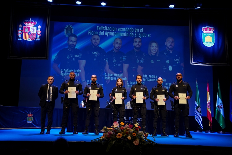 De la misma manera, se ha hecho entrega de metopas de felicitación a la Unidad de Atestados e Informes, que se consolida como un referente de calidad y valor indiscutible dentro de la mejora de la seguridad vial del municipio; y a los 63 agentes que formaron parte de los dispositivos de emergencia por el apagón energético de carácter nacional. Asimismo, se ha hecho entrega a 19 agentes de la Policía Local las felicitaciones públicas acordadas por el Pleno del Ayuntamiento de El Ejido el pasado 9 de septiembre, por sus destacadas y meritorias actuaciones.