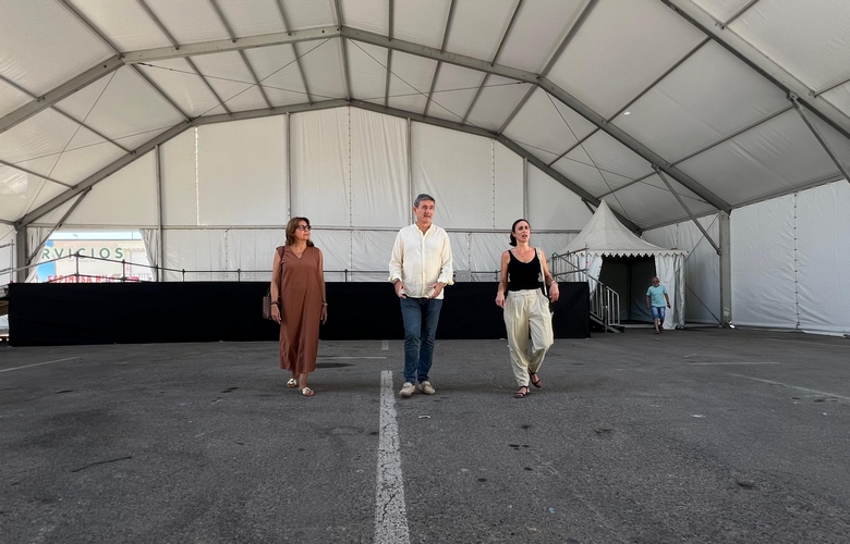 El alcalde de Adra, Manuel Cortés, acompañado por las concejalas de Cultura, Elisa Fernández, y de Presidencia, María Paz Fernández, ha visitado esta mañana los trabajos de montaje de la Caseta Municipal en el Real de la Feria, que será uno de los espacios centrales de las celebraciones en honor a la Virgen del Mar y San Nicolás de Tolentino.
