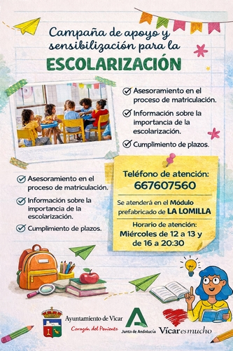 El Área de Servicios Sociales del Ayuntamiento de Vícar ha puesto en marcha una campaña de escolarización en el marco del Programa de Prevención, Seguimiento y Control del Absentismo Escolar. Una acción que se centra especialmente en las zonas de La Cimilla y La Lomilla coincidiendo con el plazo de presentación de solicitudes de admisión en centros públicos y concertados para el curso 2026-2027.