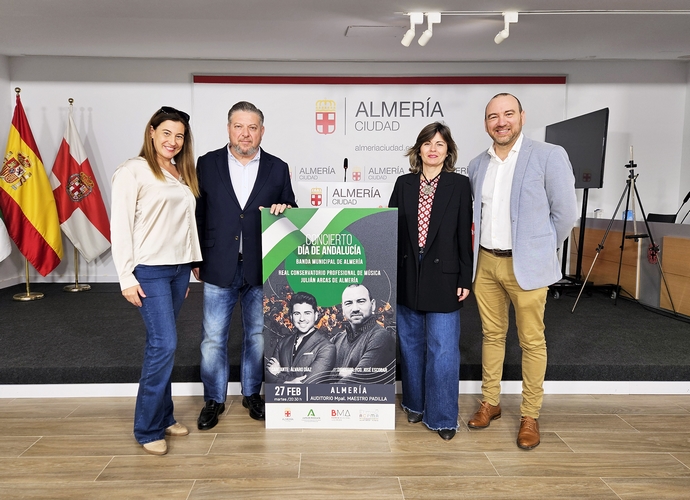 Sonarán obras del maestro Padilla, Albéniz, Turina, Manuel de Falla, Quintero, León y Quiroga… y hasta Jesús de la Rosa, letrista y voz de Triana. El Auditorio Municipal Maestro Padilla alzará el telón mañana, martes, 27 de febrero, a las 20.30 horas, al concierto especial que, con motivo del Día de Andalucía, reunirá a una fusión de la Banda Municipal de Música de Almería junto con alumnado y profesores del Conservatorio Profesional de Música ‘Julián Arcas’. Todo ello con la dirección del profesor del Conservatorio Francisco José Escobar y con la colaboración del cantante de copla Álvaro Díaz.