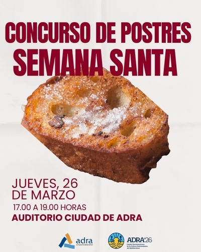 El Ayuntamiento de Adra celebrará el próximo jueves, 26 de marzo, el Concurso de Postres de Semana Santa, una iniciativa destinada a poner en valor la repostería tradicional vinculada a estas fechas. El evento tendrá lugar en el Auditorio ‘Ciudad de Adra’, en horario de 17:00 a 19:00 horas, y está abierto a la participación de cualquier persona aficionada a la repostería. El concurso contará con premios económicos para las mejores elaboraciones: 150 euros para el primer premio, 100 euros para el segundo y 50 euros para el tercer clasificado.