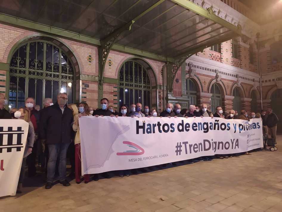 El Ayuntamiento de Almería, con la presencia de los concejales del equipo de gobierno municipal de Urbanismo, Servicios Municipales y Agricultura, Ana Martínez Labella, Sacramento Sánchez y Juan José Segura, respectivamente, se ha sumado este jueves de nuevo a la convocatoria realizada por la Mesa de Ferrocarril, en este caso a las puertas de la emblemática Estación de Ferrocarril, donde se han concentrado en torno a un centenar de personas.