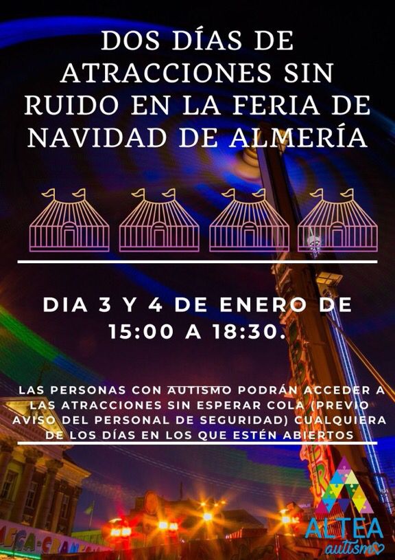 La Navidad es un tiempo para disfrutar de la familia y la amistad, sentimientos que deben ser universales para cualquier y persona y, por ello, tener un marcado carácter inclusivo. En este sentido, el Ayuntamiento de Almería, a través del Área de Cultura y Educación, habilitará dos días sin ruido en las atracciones de ‘Almeripark Navidad’, de cara a que las personas con trastorno del espectro autista o síndrome de Asperger puedan también disfrutar de los ‘cacharricos’.