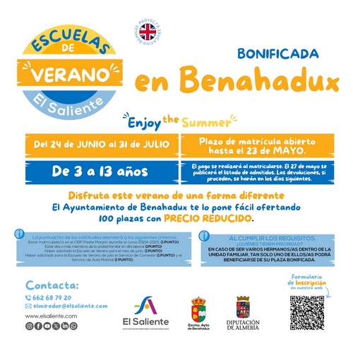 El Ayuntamiento de Benahadux, en colaboración con la Asociación El Saliente y la Diputación Provincial de Almería, pone en marcha las Escuelas de Verano ‘Enjoy the Summer’, un programa que ofrece a las familias del municipio una alternativa educativa y entretenida para los más pequeños durante los meses de verano. La iniciativa se desarrollará del 24 de junio al 31 de julio y está dirigida a niños y niñas de entre 3 y 13 años.