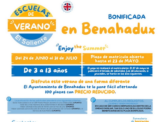 El consistorio benaducense pone a disposición de las familias 100 plazas para la escuela de verano con un precio reducido para el mes de julio, dirigidas a los niños y niñas que cumplan con los criterios establecidos en las bases de la convocatoria. Entre los requisitos para obtener puntos se encuentran: estar matriculado/a en el CEIP Padre Manjón durante el curso 2024-2025, estar dos o más miembros de la unidad familiar en alta laboral, haber solicitado la Escuela de Verano en el mes de junio y solicitar además el servicio de comedor o aula matinal en junio. En caso de cumplir todos los requisitos y ser varios hermanos dentro de la misma unidad familiar, tan sólo uno de ellos podrá beneficiarse de su plaza bonificada.