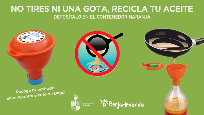 Las acciones comenzaron el pasado sábado, durante la I Jornada de la Familia, donde se llevó a cabo un taller de reciclaje para los más pequeños y se distribuyó entre las familias un embudo para facilitar el depósito de aceite en botellas de plástico que, cuando estén llenas, será necesario cerrarlas bien y depositarlo en uno de los contenedores naranjas. Estos embudos se pueden recoger de forma gratuita desde este martes en la recepción del Ayuntamiento de Berja, abierto de 9:00 a 14:00 horas.