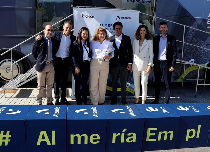 El equipo de selección de Clece y filiales ha llegado al municipio con el autobús de la Ruta ‘Almería Emplea’ y ha contratado en directo a Herminia Cortés como auxiliar de Ayuda a Domicilio.