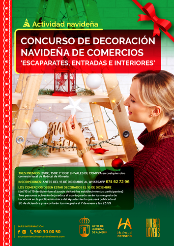 En cuanto al concurso de decoración navideña, los comercios interesados podrán inscribirse hasta el 15 de diciembre. Este se desarrollará del 20 de diciembre al 7 de enero y contará con un jurado que emitirá su voto sobre los comercios participantes, además de un voto popular que saldrá de las interacciones (‘me gusta’) a través de redes sociales en la publicación original que realizará el Ayuntamiento de Huércal de Almería el mismo día 20.