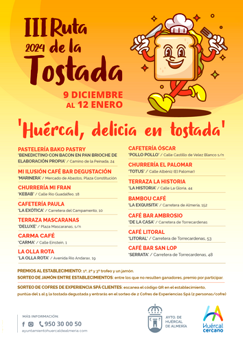 El Ayuntamiento de Huércal de Almería ha impulsado un año más su plan de Navidad para apoyar a los comercios de la localidad con varias iniciativas con las que promocionarlos: la tercera edición de la Ruta de la Tostada, un Concurso de Decoración Navideña de Comercios, mercadillos y el sorteo de una Mega Cesta navideña, todas ellas incluidas dentro de un ambicioso programa de más de 70 actividades que se van a desarrollar en el municipio huercalense durante la Navidad.