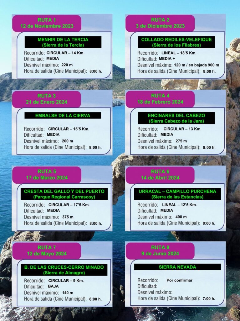 La primera ruta se desarrollará el próximo 12 de noviembre y discurrirá en Menhir de la Tercia (Sierra de la Tercia), con un recorrido total de 14 km con una dificultad media y un desnivel máximo de 220 m. La siguiente ruta será el 3 de diciembre por la Sierra de los Filabres en un recorrido lineal de 18,5 km y desnivel máximo de 120m en bajada 900 m.
