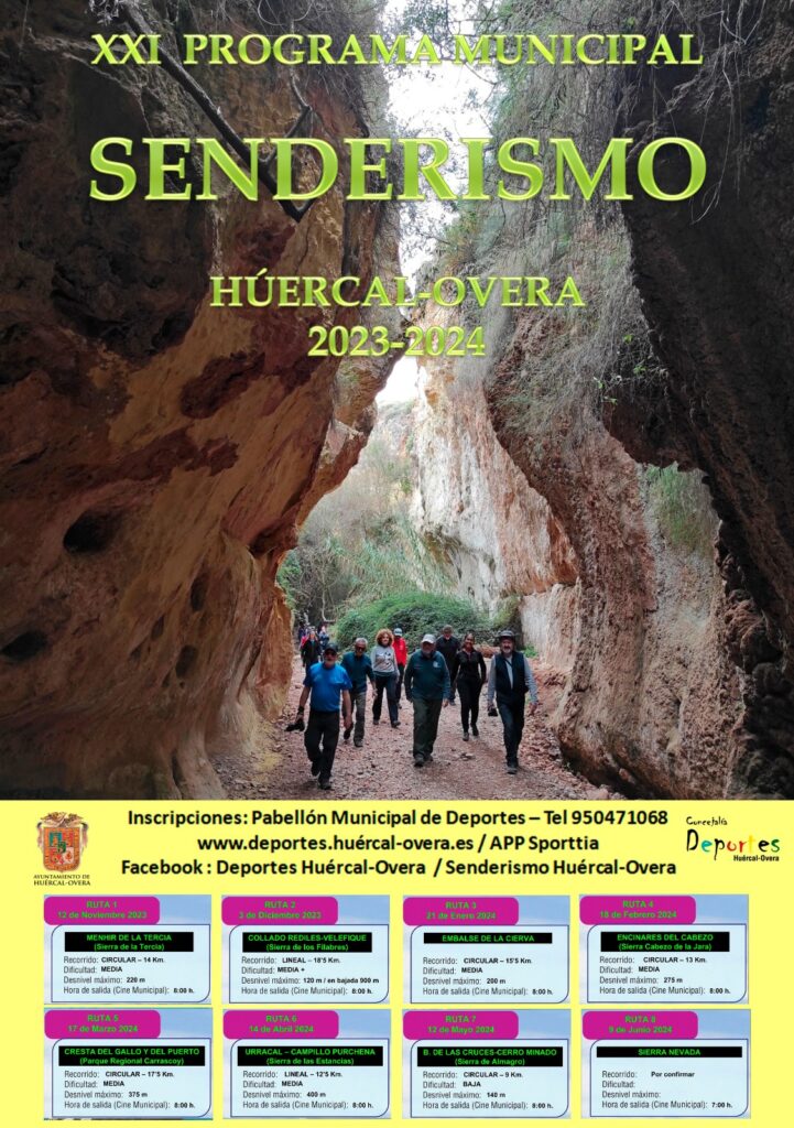 El concejal de Deportes del Ayuntamiento de Huércal-Overa, Andrés Sánchez, junto con el coordinador del senderismo municipal, Juan Luis Fernández, han presentado el XXI Programa Municipal de Senderismo de Huércal-Overa 2023/2024. Un programa que tiene por objetivo disfrutar de la naturaleza y el deporte con ocho rutas en las que descubrir magníficos entornos naturales.