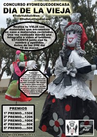 La Concejalía de Cultura del Ayuntamiento de Pulpí organiza el Concurso “Día de la Vieja en Casa”, a través de Facebook, y en conmemoración al Día de la Vieja, que se celebra este jueves 19 de Marzo en el municipio de Pulpí, y que debido a la emergencia sanitaria ocasionada por el Covid-19, han sido suspendidos los actos previstos. Por este motivo, y teniendo en cuenta la medida de prevención de no salir de casa impuesta por las autoridades, el Ayuntamiento propone con el fin de hacer más entretenidos los próximos días, un concurso dirigido a todas las edades; desde los más pequeños con dibujos o manualidades, empleando como temática principal el “Día de la Vieja”, hasta los mayores con la realización de Viejas de distintos materiales reciclados.