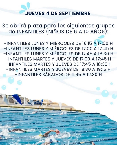 - Viernes 5 de septiembre. Solicitud para los grupos de bebés (de 18 a 36 meses), tecnificación para +8 y jóvenes de entre 11 y 16 años en diferentes horarios y días.