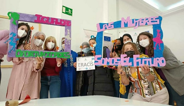 Previamente, representantes de estas tres entidades ERACIS junto con técnicas del programa de comunidad gitana de los Servicios Sociales, se desplazaron al barrio vicario de La Cimilla para fomentar la participación de las mujeres residentes en esta zona a través de una sesión fotográfica en torno a un photocall en la que se tomaron fotos con la intención de transmitir un mensaje relacionado con la celebración del 8M. Estas instantáneas podrían usarse en una futura exposición.