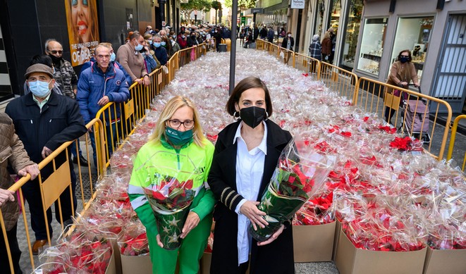 La entrega de esta flor de pascua se ha iniciado este miércoles en el Mercado de Los Ángeles, con un millar de pascueros, y en los comercios del barrio y ha continuado en la puerta del Mercado Central. Esta tarde serán las tiendas de Nueva Andalucía los que reciban la visita de los pascueros municipales.