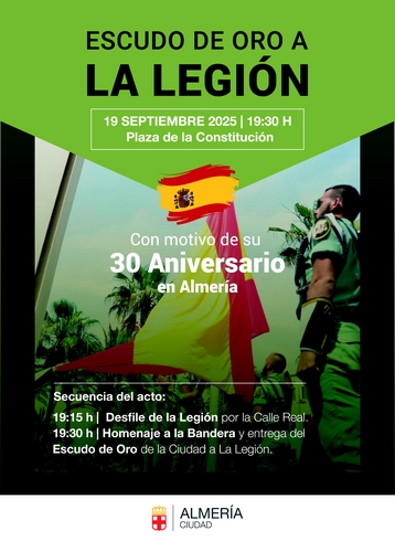 El Ayuntamiento hará entrega a la Legión del Escudo de Oro de la Ciudad con motivo del XXX aniversario de su llegada a Almería
