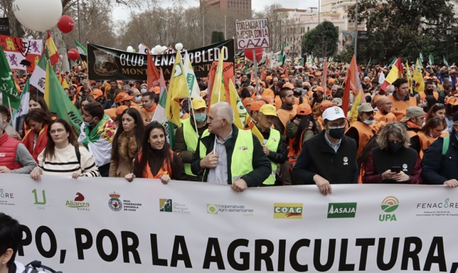 La cita convocada por ASAJA, COAG, UPA, Real Federación Española de Caza (RFEC), Oficina Nacional de la Caza (ONC), Unión de Criadores del Toro de Lidia (UCTL), Federación Nacional de Comunidades de Regantes de España (FENACORE), Cooperativas Agro-alimentarias y Alianza Rural, ha provocado el colapso de la ciudad en las horas previas a la manifestación, donde más 45 tractores, caballos, ovejas, perros de rehalas, cetreros, cazadores, agricultores, ganaderos, gente del mundo rural… han llenado el Paseo de la Castellana en una protesta iniciada en la plaza del Emperador Carlos V hasta Fuente de San Juan de la Cruz, frente al Ministerio de Transición Ecológica.