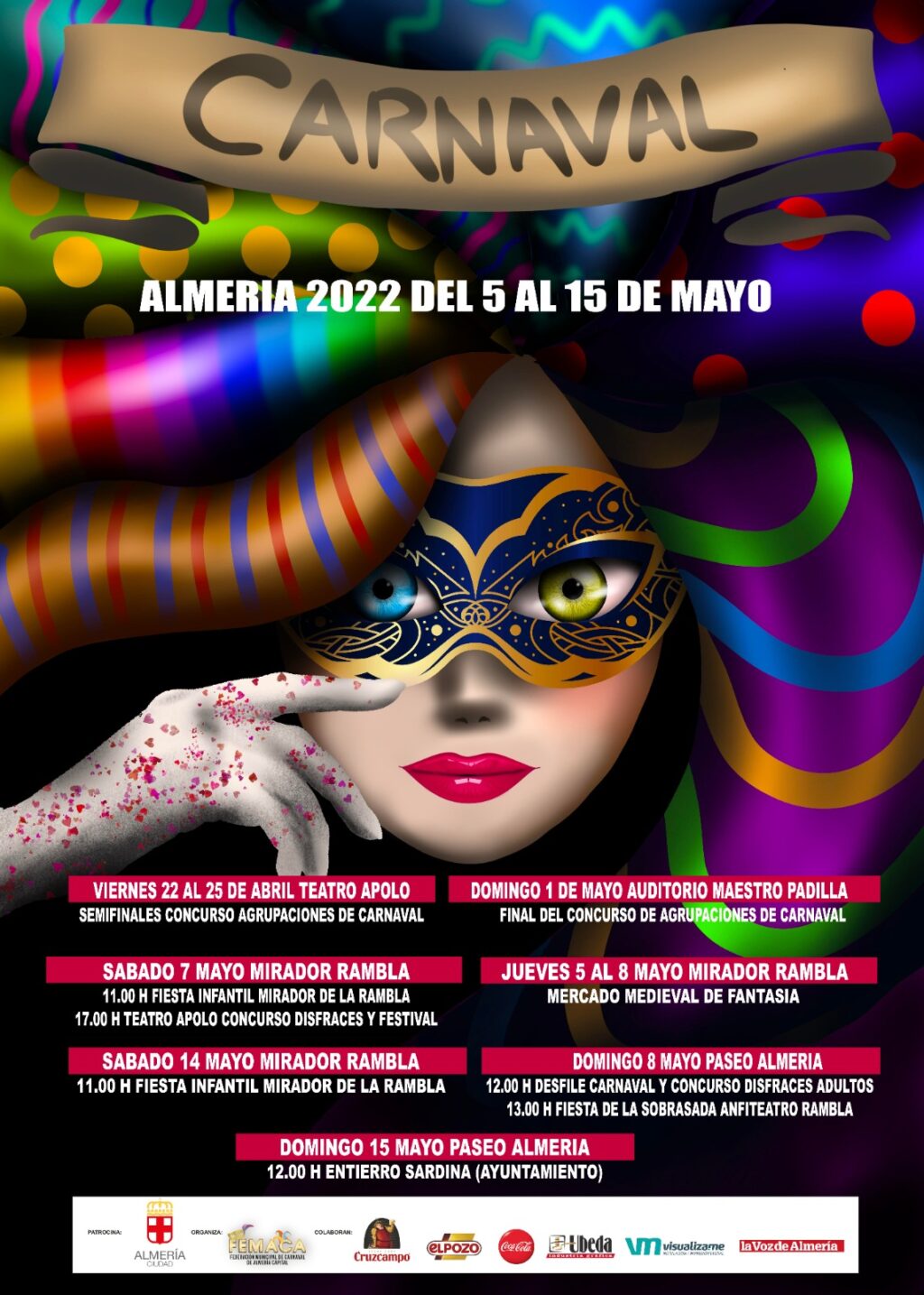 El Carnaval de Almería de 2022 ya tiene nuevas fechas. En un ejercicio de responsabilidad, tanto el Área de Cultura y Educación del Ayuntamiento de Almería como la Federación Municipal de Carnaval de Almería (FEMACA) decidieron a comienzos del pasado mes de enero retrasar a la primavera y tras Semana Santa la celebración de este año, dados los altos índices de incidencia de entonces. De esta forma, las nuevas fechas quedan de la siguiente manera: el concurso de agrupaciones volverá a ser la antesala, celebrando sus semifinales en el Teatro Apolo, del 22 al 25 de abril y la final en el Auditorio Municipal Maestro Padilla el 1 de mayo, con el pregón al inicio. Las actividades del ‘Carnaval de calle’ serán del 5 al 15 de mayo.