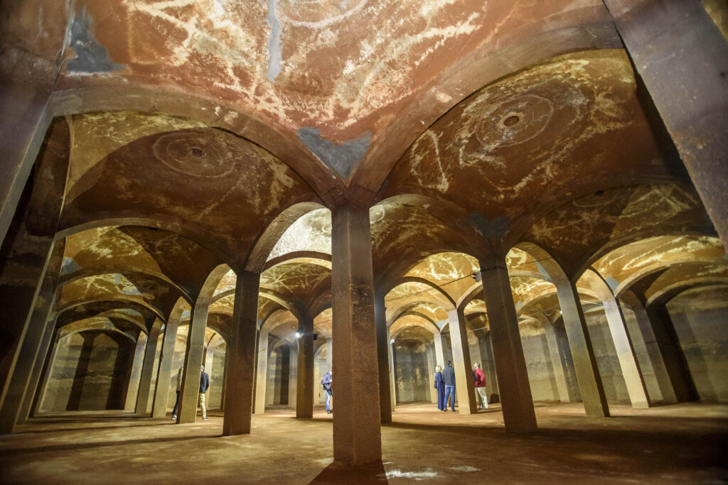 1.- Depósitos de agua Santa Isabel. Avenida de Santa Isabel, 3 (Ficha nº46): Construcción semienterrada del año 1888, etapa próspera en la historia de Almería en pleno desarrollo económico y demográfico en que la prosperidad de la minería del hierro y la uva hizo que la población se duplicara. Ello desencadenó en la ejecución de unas infraestructuras más modernas. La construcción de estos depósitos consiguió mejorar la salubridad del agua, que entonces era muy deficiente y por tanto, rebajar las enfermedades que ello provocaba. El proyecto fue redactado por Enrique López Rull y la dirección de obra fue llevada a cabo por Trinidad Cuartara Cassinello. El edificio está constituido por un entramado de pilares, arcos de piedra natural y bóvedas de ladrillo recubuierto con mortero hidráulico. Cada bóveda cuenta con un pequeño respiradero en el centro para impedir humedades de condensación. Cuando los depósitos están vacíos, estos respiraderos ofrecen un juego de luces de llamativa singularidad. La cal que tiene el agua, incrustada en los pilares, dota a los depósitos de una mayor estanqueidad. También la presencia de hierro y otros minerales en el agua le aportan a la piedra un color rojo-anaranjado. El conjunto desprende una atractiva arquitectura que simula los antiguos aljibes árabes. Son los depósitos más antiguos de la ciudad y en la actualidad siguen en activo, abasteciendo a casi el 20% de la población. El conjunto está dotado de dos depósitos, cada uno con una capacidad de 3000m3. Una tubería de 70cm de diámetro llena los depósitos, y los conecta con los de San Cristóbal y la Pipa Alta.