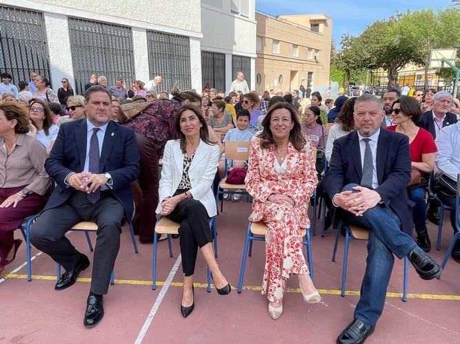 El alumnado de diferentes generaciones se reunió en la tarde de ayer, viernes, en el patio del CEIP Lope de Vega para compartir la alegría por el 75º Aniversario de este centro de enseñanza, mientras contemplaban las palabras, bailes y música de los estudiantes matriculados en el actual curso académico. Ha sido el broche de oro a unas celebraciones que han contado con la presencia de la Primera Teniente de Alcalde del Ayuntamiento de Almería, Sacramento Sánchez, y el concejal de Cultura Diego Cruz, así como de la consejera de Desarrollo Educativo y Formación Profesional, María del Carmen Castillo, y el delegado territorial Francisco Alonso, y, por supuesto, la directora del centro, Celia María Rodríguez.