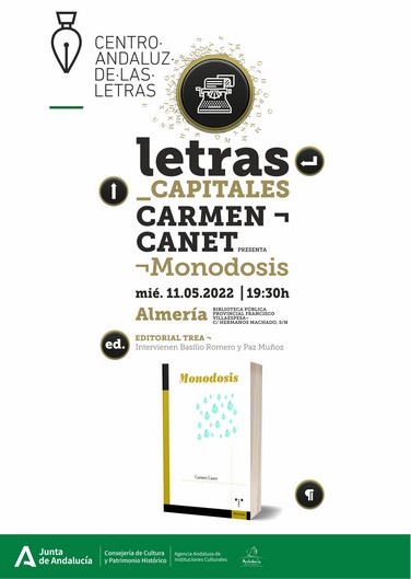 El Centro Andaluz de las Letras de la Consejería de Cultura presenta en Almería el libro de aforismos ‘Monodosis’ de Carmen Canet, publicado por Ediciones Trea. Esta cita literaria, que tendrá lugar el próximo miércoles 11 de mayo a las 19:30 horas en la Biblioteca Pública Provincial Francisco Villaespesa, está enmarcada dentro del ciclo Letras Capitales. La autora estará acompañada por Basilio Romero y Paz Muñoz.